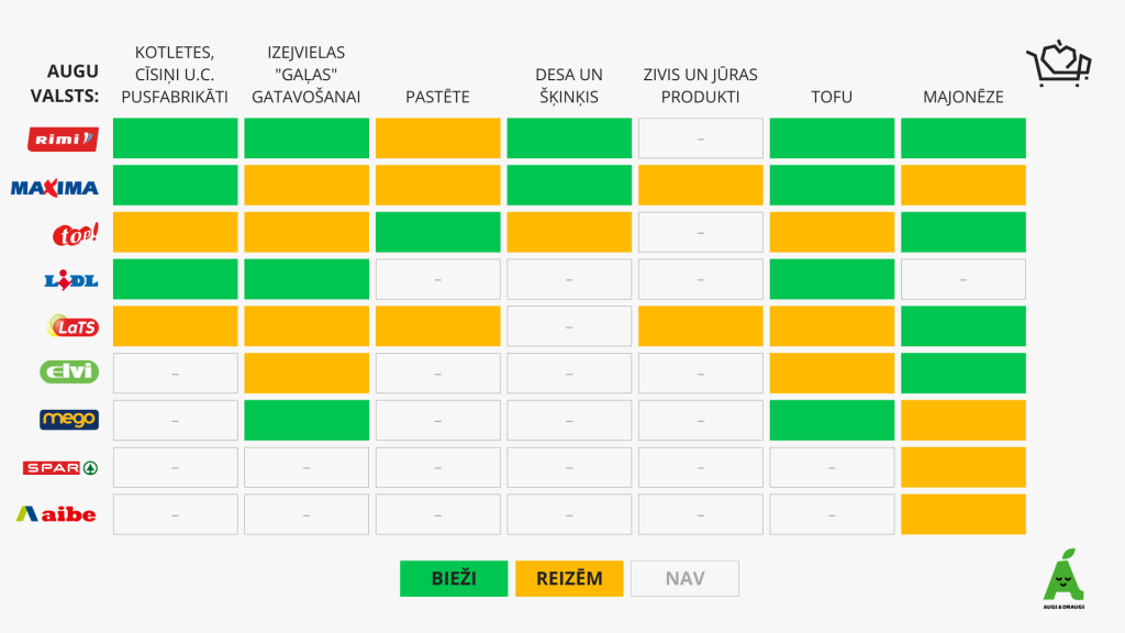 Augu valsts produktiem bagātākais piemājas veikals ceturto gadu ir Rimi. Citi tīkli ik gadu sacenšas ar pakāpeniskiem uzlabojumiem sortimentā – reitingā augstākas vietas nekā pērn ieguvuši Maxima, top! un Lidl, kamēr LaTS saglabājis vidēju pozīciju, savukārt Elvi un Mego nonākuši zemāk. Jaunpienācējs, starptautiskais veikalu tīkls SPAR, šogad atrodas priekšpēdējā vietā virs Aibe, kaut arī ārzemēs piedāvā augu valsts produktu līniju.